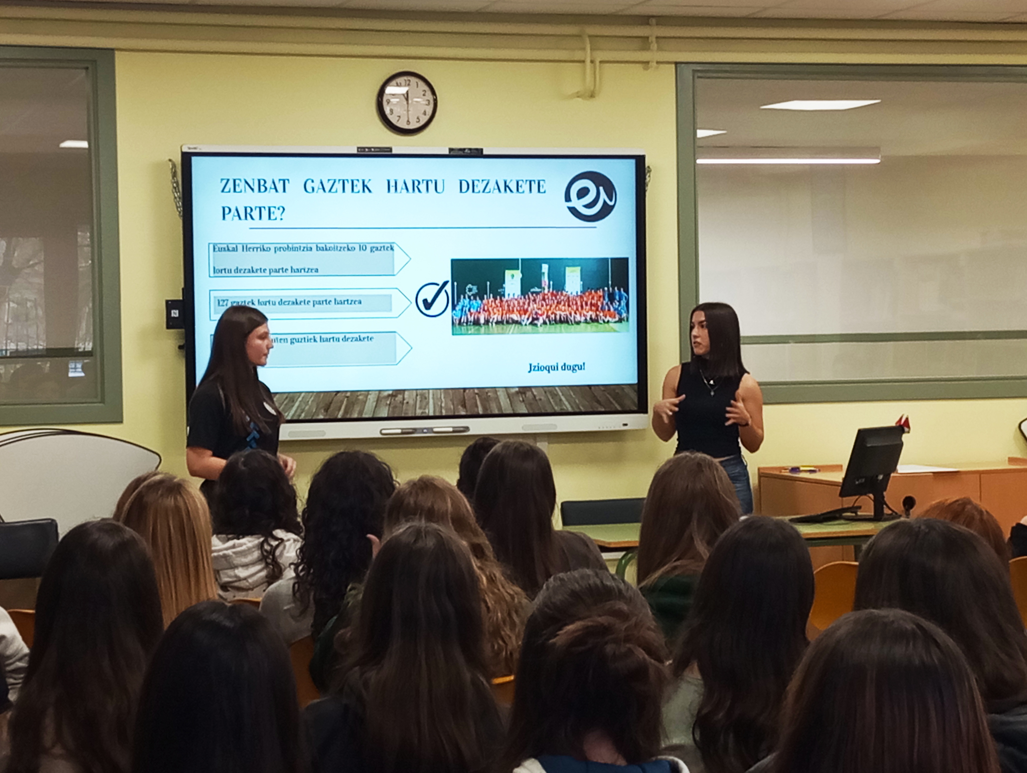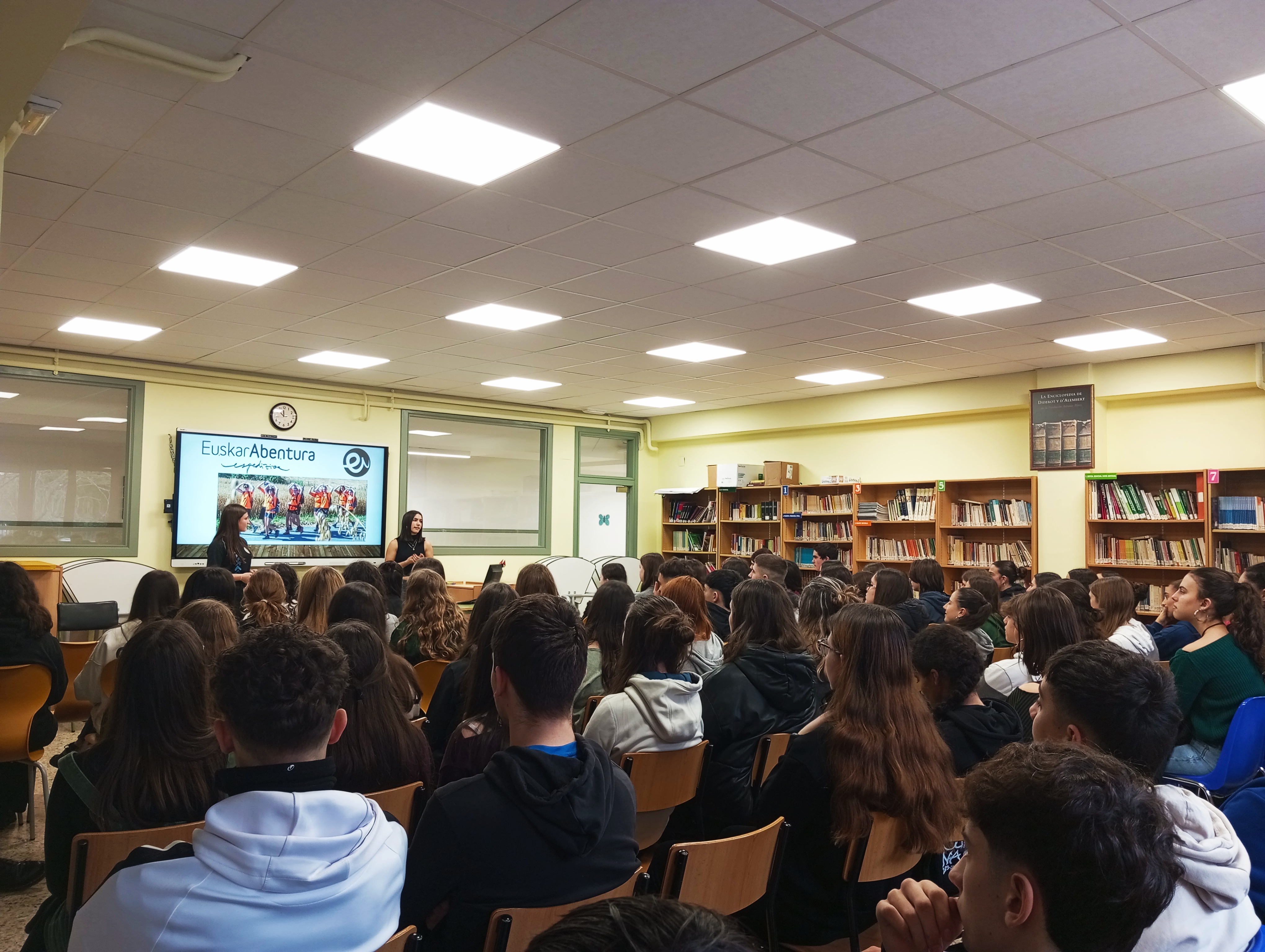 Batxilergoko 1. mailako ikasleek Euskarabentura proiektua ezagutzeko aukera izan dute Saioa Iribarren eta Saioa Gelbenzu ikasleeen eskutik.